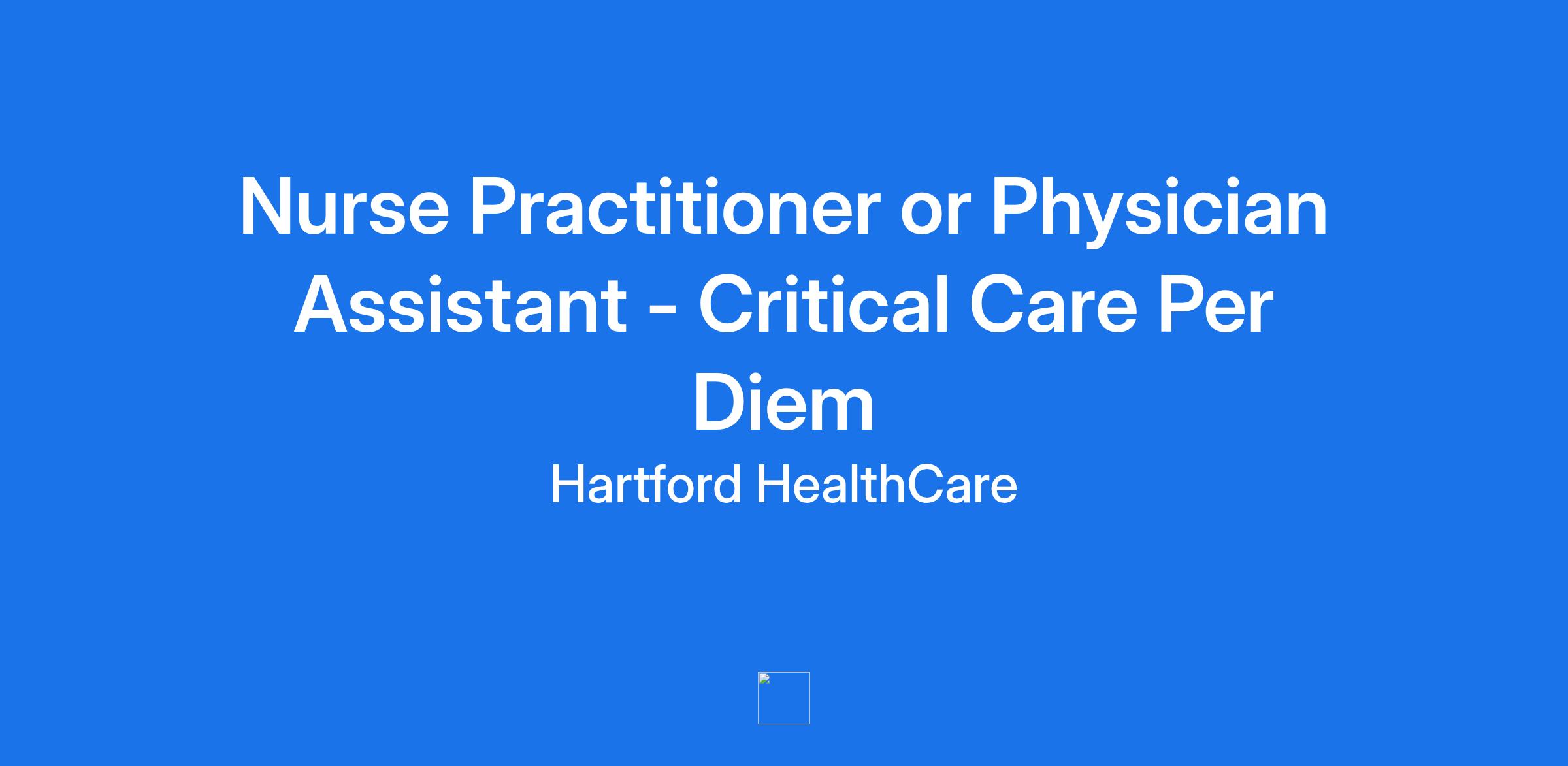 *Nurse Practitioner and Physician Assistant Benefits:* * Market-leading compensation and benefits and generous paid time off * Paid CME time off plus CME budget, reimbursed professional licenses and dues * Enhanced Tuition Assistance and Higher Education Partnerships * Voluntary benefits include student loan programs, home, auto, renters insurance, identity theft protection, legal services, low-interest loans, pet insurance and more! * Employee discount programs and colleague assistance offering resources and information for personal and work-life issues * Family care benefits through Care.com including emergency back-up care benefit for children, adults and even pets! *Position Details:* Saint Vincent's Medical Center is seeking a Nurse Practitioner or Physician Assistant to join a strong, collaborative team of Critical Care Intensivists. The successful candidate will provide holistic, high quality care to critically ill patients admitted to the critical care unit. With your comprehensive knowledge of acute critical care conditions, diagnostics & treatments, you will be expected to diagnose, treat, and manage acute & chronic diseases, perform procedures, order and interpret diagnostic tests, speak to patients & families about their conditions, and collaborate with a variety of consultants. * * *Role*: Physician Assistant or Acute Care Nurse Practitioner *Location*: 2800 Main Street, Bridgeport, 06606 *Setting*: Inpatient, critical care intensivists *Schedule:* Per diem *Hartford HealthCare supports Nurse Practitioners and Physician Assistants in practice:* · Dedicated support and voice for our for Nurse Practitioners and Physician Assistants through the*Office of Advanced Practice*directed by Sarah Clark, MBA, MHS, PA-C, BSN, RN, System Director of Advanced Practice · Hartford HealthCare is one of the largest,*non-profit*, fully-integrated healthcare systems providing patient care in the state, allowing our providers to care for their patients no matter where they reside in Connecticut · With tools like*EPIC*, Hartford HealthCare’s state of the art clinical and informatics technology promotes improved patient outcomes, streamlined continuity of care and superior provider satisfaction *About St. Vincent’s Medical Center:* St. Vincent’s Medical Center is a Magnet Hospital that has been named*Best Hospital in Fairfield County*and in all of Western Connecticut for 2013 - 2014 by US News & World Report. We are the primary teaching hospital for the Frank Netter School of Medicine at Quinnipiac University. St. Vincent’s Medical Center was the first institution in the state to pioneer endovascular vein harvesting. *About Hartford HealthCare:* · Honored as a “*Best Organizations for Leadership Development*” by the National Center for Healthcare Leadership (NCHL) · Prestigiously named one of the “*Best Hospitals to Work for in Connecticut*” by the Becker's Hospital Review · Committed to*continuous development*through The Center for Education Stimulation & Innovation (CESI), our Provider Leadership Development Institute and a robust on demand learning platform including CME, special courses, learning series and tools and resources · Established*Mentorship and Orientation*programs specially designed for newly hired providers and providers new to practice *Nurse Practitioners and Physician Assistants Role Scope:* Under established guidelines and in collaboration and/or supervision with the practice physician(s), Nurse Practitioners and Physician Assistants perform routine physical examinations, and formulate medical, educational, and psychosocial plans to treat patients. In consultation with the physician(s) and care team members, Nurse Practitioners and Physician Assistants develop plans for further evaluation of health needs, e.g., referral to other health team members or specialists. Nurse Practitioners or Physician Assistants provide appropriate treatment for problems within the scope of the provider’s practice as designated by protocols and identifies problems outside of their scope of practice and refers appropriately to physician. *Requirements:* * *Licensure*: Unrestricted State of Connecticut Medical License (or eligible) * *Training*: Physician Assistant or Acute Care Nurse Practitioner * *Experience*: 1 years as an advanced practice provider in a critical care setting. Neurocritical care experience highly preferred. Interested candidates please contact Victor Rodriguez, Advanced Practice Recruiter, at Victor.Rodriguez2@hhchealth.org. **Job:** **Hospitalist/Emergency* **Organization:** **Hartford HealthCare Medical Group Specialists* **Title:** *Nurse Practitioner or Physician Assistant - Critical Care Per Diem* **Location:** *Connecticut-Bridgeport-St Vincents Medical Center (10427)* **Requisition ID:** *23164694*