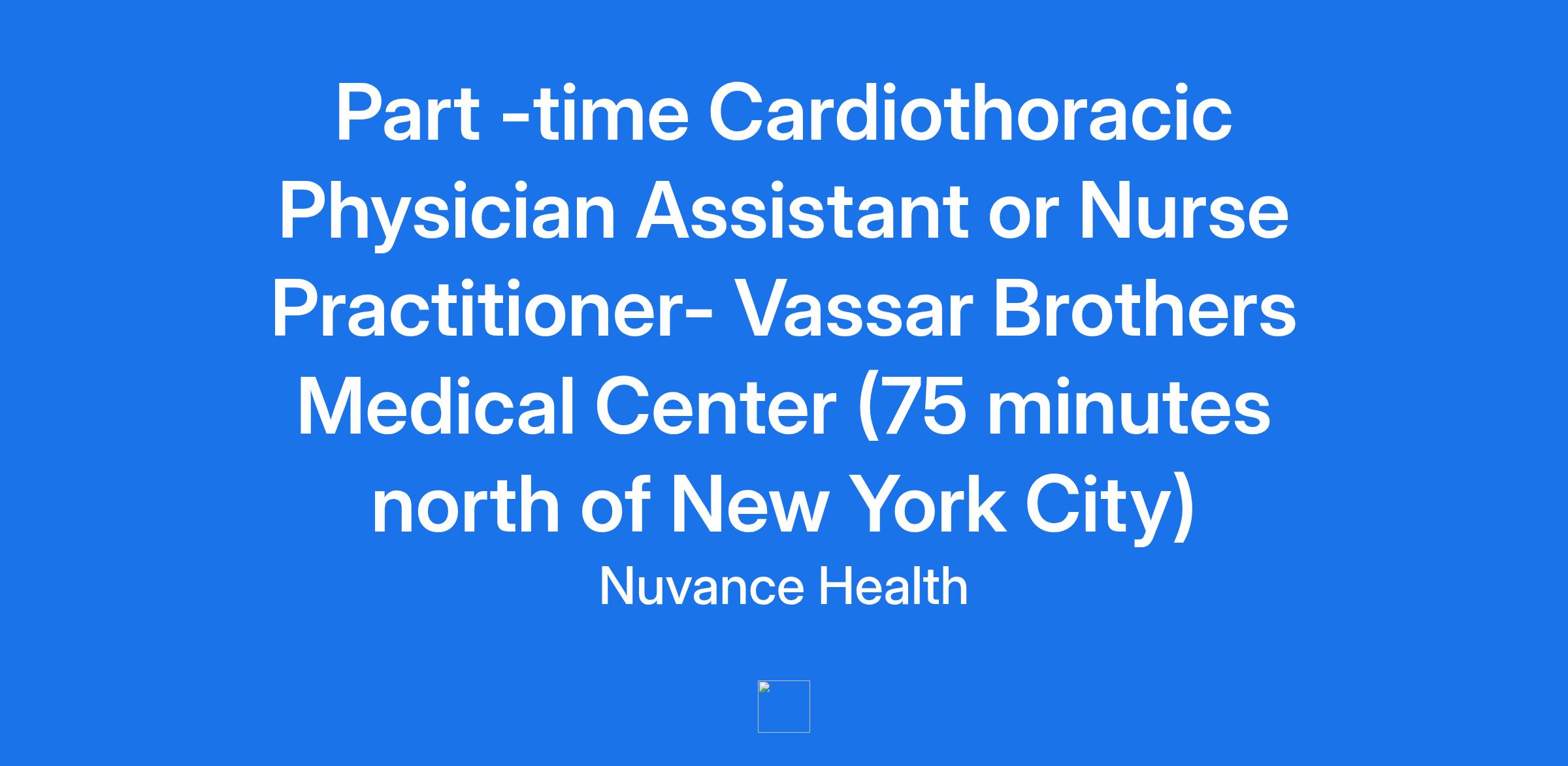 Vassar Brothers Medical Center, part of Nuvance Health, is seeking a part time Cardiothoracic Surgery Physician Assistant or Nurse Practitioner to join its growing team in Poughkeepsie, New York, located just 75 minutes north of New York City.
