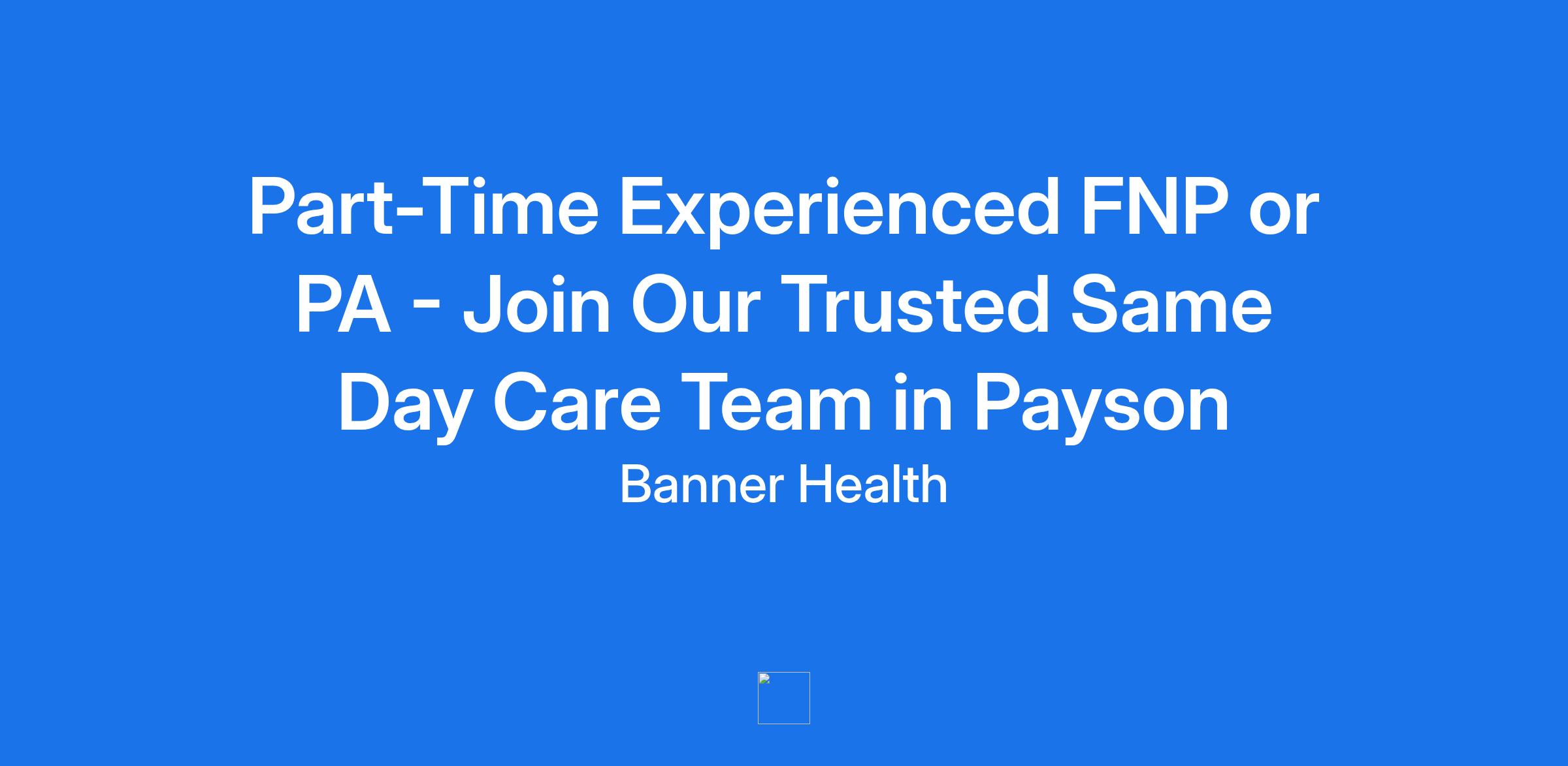 Join **Banner Health** , a Top 5 Large Health System, as an **experienced Part-Time Family Nurse Practitioner or Physician Assistant** in our **Same Day Care Clinic** in Payson, AZ.Provide a broad range of acute care in a supportive, patient-centered environmentwhile enjoying flexible hours and excellent work/life balance.
